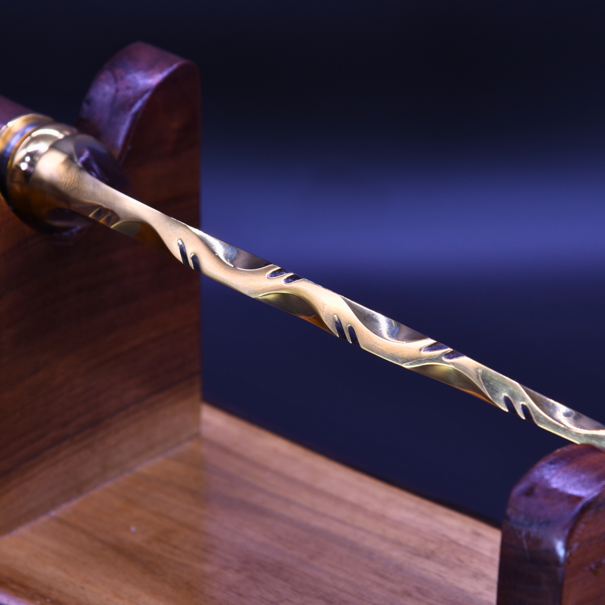 Rooted in strength. Etched in flame. The Ironleaf is a force of nature — a blade that bridges fire and forest, tradition and fury. Its curved steel silhouette is veined with a golden fern, carved deep into a polished surface that gleams like forged sunlight. The contoured hardwood handle flows with grain and power, shaped for those who move with instinct and strike with authority.